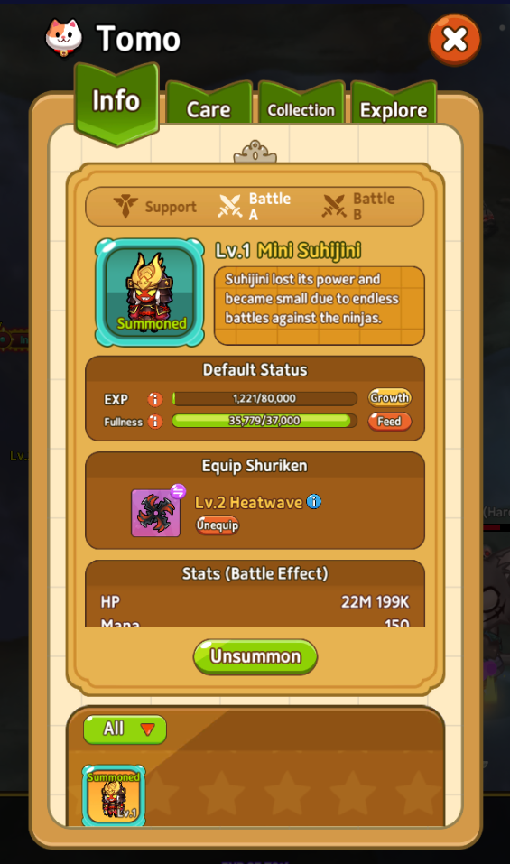 전투형 소환수들은 플레이어의 편에 서서 표창과 고유의 특수 능력을 이용하여 전투에 임합니다. 그들의 뛰어난 능력치와 강력한 특수 능력은 게임의 전투 양상을 더욱 다채롭게 만들어줍니다. 전투형 소환수의 도움으로 플레이어는 닌자 세계의 평화라는 원대한 목적에 한 걸음 더 나아갈 수 있습니다.