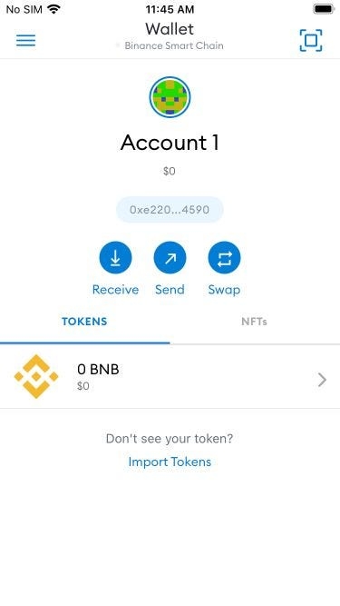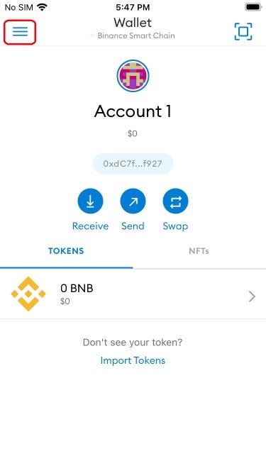 6. Check that the phrase ‘Binance Smart Chain’ appears in the wallet main menu. Then click on the ‘Add token’ button on the bottom.